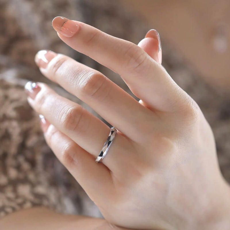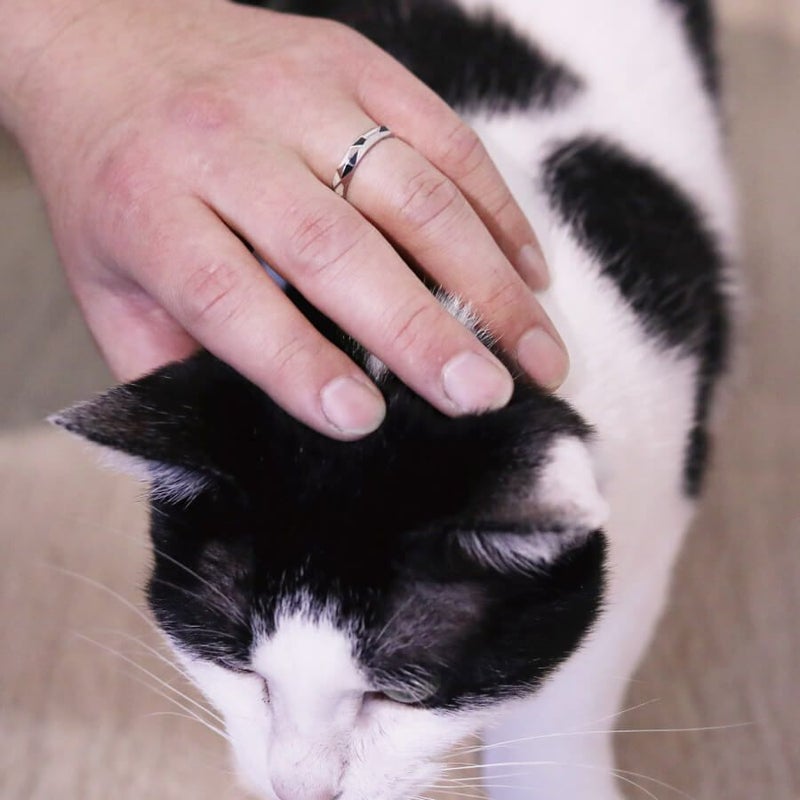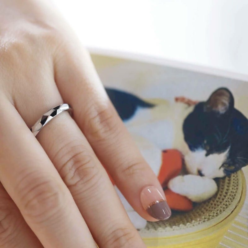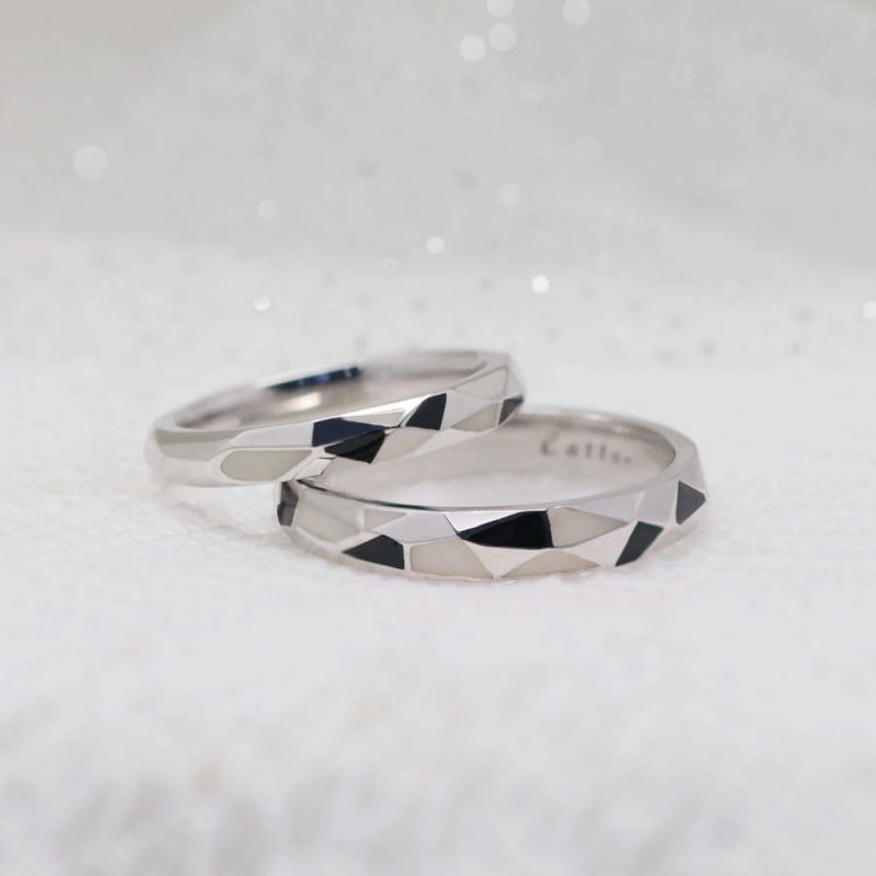 白と黒を大胆にちりばめたハチワレをモチーフとしたデザインが完成。Cattonオリジナルです。 ねこが大好きなお二人にとって特別感の高い、モノトーンで落ち着きのある特別な結婚指輪。 甲丸リングを多面カットにし、各面に白と黒のエポキシ樹脂を施しました。白と黒で白黒ハチワレ猫をイメージしました。 猫が大好きなお二人は、いつも猫も一緒にいることができる、家族のしるしです。 エポキシの色は変更ができます。(三毛猫であれば白、茶、黒の3色など)