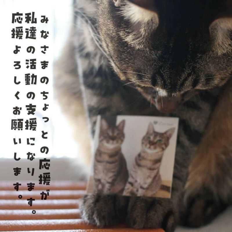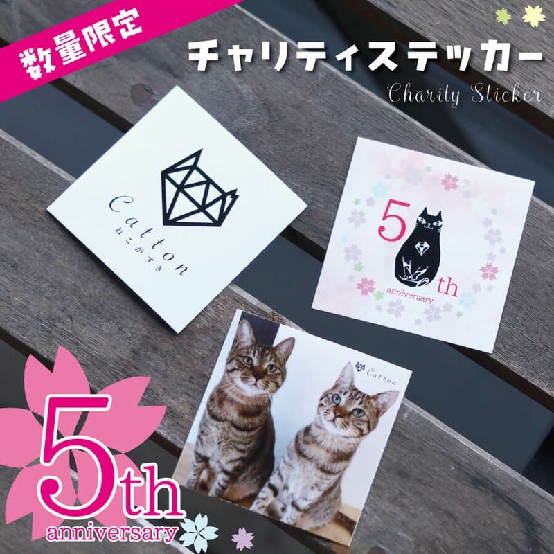 多くの方からの応援を経てCattonは5周年を迎えることができました。お祝いを兼ねてNEWデザインチャリティステッカーを販売いたします。 CattonロゴはCattonファンの方からのご要望を受けて作りました。せい&しょうは1年間Cattonで過ごしていますが、運命の出会いまで応援していただきたいという私たちの願いを込めて作りました。 みなさまのちょっとの応援が私達の活動の支援になります。ステッカー1枚350円のうち、150円を保護猫活動に充てさせて頂きます。 何卒ご協力のほどよろしくお願いいたします。