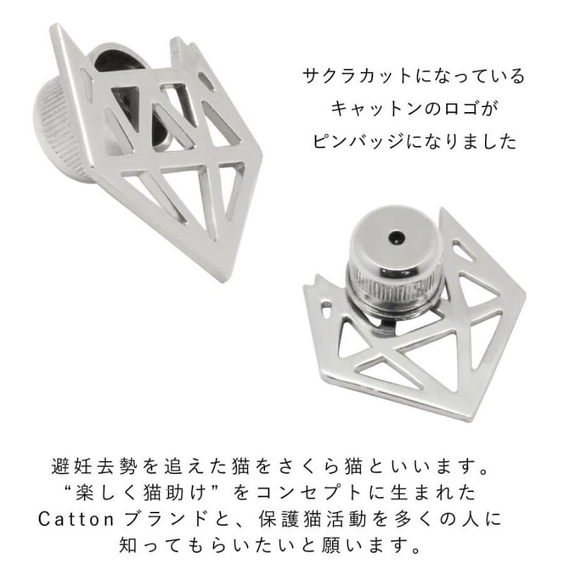 サクラカットを施した猫“サクラ猫”をモチーフにしたCattonのロゴがこの度ピンバッジになりました。 Cattonでは、“楽しく猫助け”というコンセプトのもと、ジュエリーを楽しみながら猫助けを出来ればという想いからこのロゴが生まれました。 保護猫へのたくさんの想いがつまったこのロゴを身に着けることで、Cattonブランドと保護猫活動を多くの方に知ってもらいたいと願います。 Cattonの活動を伝えるパッケージ付き。集めるのもいいし、保護猫活動を伝えたい人へのちょっとしたプレゼントにも。 【さくら猫ってなに?】 不妊手術済みのしるしに、耳先をさくらの花びらの形にカットした猫のことです。この耳のことを、さくら耳といいます。 “楽しく猫助け”をコンセプトに生まれたCattonブランドと、保護猫活動を多くの人に知ってもらいたいと願います。 キャットン商品をお買い上げいただきますと収益の一部を保護猫活動に使用いたします。