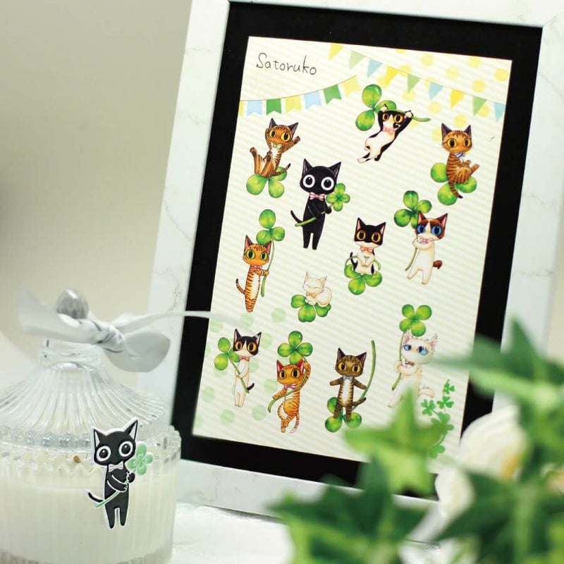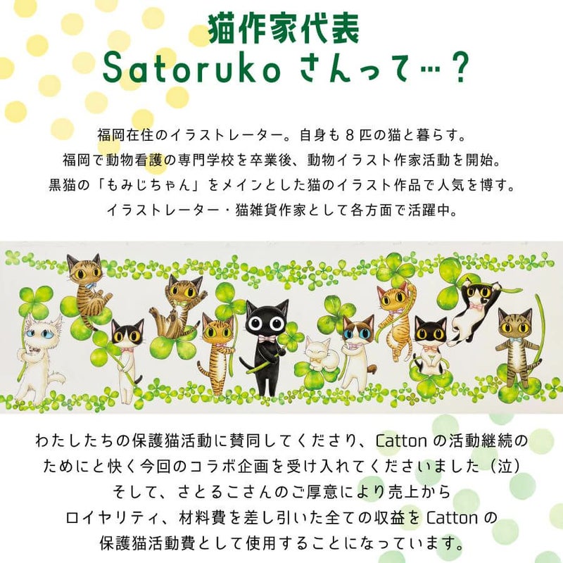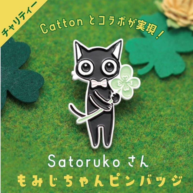 全国で大人気の猫作家さとるこさんとのコラボグッズ! 福岡で猫イラストレーターとして活躍されているさとるこさんは 愛くるしい猫たちのイラストで全国で大人気の猫作家さんなんです。 特に人気の黒猫もみじちゃん作品をもとに Cattonでチャリティーピンバッジを作り販売を行うこととなりました。 お洋服やカバンにつけるのはもちろん可愛いのですが、 台紙に刺したまま飾っていてもかわいいのです。 さとるこさんのご厚意により売上から販売手数料、ロイヤリティ、材料費を差し引いた全ての収益をCattonの保護猫活動費として使用いたします。 さとるこさんとは・・。 福岡在住のイラストレーター。自身も8匹の猫と暮らす。福岡で動物看護の専門学校を卒業後、動物イラスト作家活動を開始。黒猫の「もみじちゃん」をメインとした猫のイラスト作品で人気を博す。イラストレーター・猫雑貨作家として各方面で活躍中。