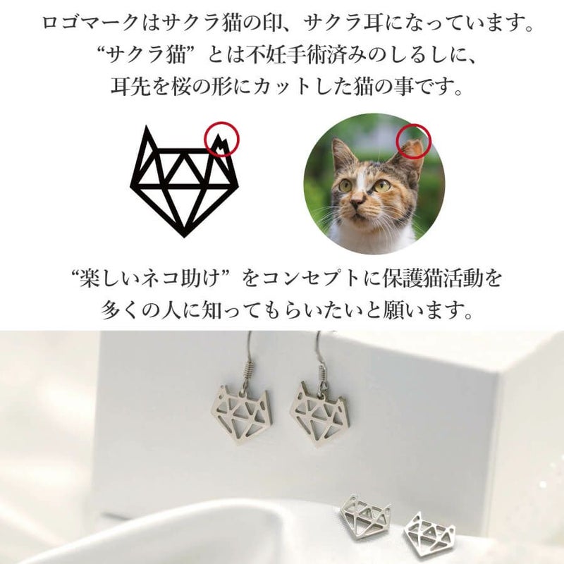 耳がサクラカットになっているロゴで作ったピアス。 さくら猫×ダイヤモンドをモチーフとしたブランドロゴをかわいく身に着けることができます。 さくら猫ってなに? 不妊手術済みのしるしに、耳先をさくらの花びらの形にカットした猫のことです。この耳のことを、さくら耳といいます。 “楽しく猫助け”をコンセプトに生まれたCattonブランドと、保護猫活動を多くの人に知ってもらいたいと願います。 キャットン商品をお買い上げいただきますと収益の一部を保護猫活動に使用いたします。